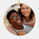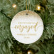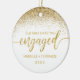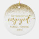 Para o seu primeiro Natal engajado este elegante ornamento de feriado apresenta uma simples design de tipografia falsa com brilho de ouro que diz "Nosso Primeiro Natal engajado" com seus primeiros nomes e ano para personalizar em branco. A parte de trás do ornamento apresenta uma foto para você mudar para a sua. Boa sorte no seu futuro casamento! Desenhado pela artista ©Susan Coffey.