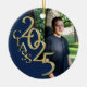 Os formandos vão adorar este ornamento personalizado de fotos de feriado disponível nas suas próprias cores escolares Este ornamento de fotos "Classe 2025" em ouro e azul escuro pode ser personalizado com um nome e texto no verso ou adicionar outra foto.