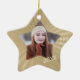 A frente deste ornamento em forma de estrela mantém a imagem do seu formando em um quadro que corresponde à forma do ornamento. O ano do formando é de ouro pálido na parte inferior direita da foto, e tudo é enquadrado em fundo com um padrão de ouro brilhante. A parte de trás do ornamento tem o mesmo padrão de ouro, com a estrela branca central segurando seu texto personalizado em ouro mais escuro. Um belo guardião para qualquer formando!