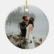 Celebre o seu primeiro Natal casado com este Enfeites de natal quente e suave que mostra a sua foto de noivado no fundo, um fundo de latido de pássaro e coroa verde de eucalipto, e personalizado com os seus nomes, ano de casamento, e "Nosso Natal de rua como Sr. & Sra." em tipografia escrita à mão. Copyright Elegant Invites, todos os direitos reservados.