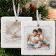 O ornamento fotográfico de parto de bebê com flocos de neve brancos delicados em um fundo natural macio. O modelo fotográfico está pronto para você adicionar sua foto de bebê, que é enquadrada com suas estatísticas de natalidade recém-nascida. Você pode adicionar a mesma foto ou outra no verso, ambas exibidas em formato quadrado, de modo que, se você tiver algum problema com a colocação, tente recortar a foto em um quadrado e recarregar.