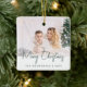 Deseje a família e amigos como um Feliz Natal com este moderno ornamento minimalista de manutenção de fotos. O texto verde-escuro diz "Feliz Natal" no roteiro de moda. Substitua facilmente a imagem de exemplo por sua foto favorita e adicione seu nome ou nomes de família e o ano abaixo. Uma tela de gradiente branco ajuda a fazer o pop de sobreposição de texto.