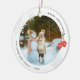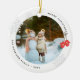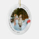 Enfeite moderno de Natal com foto redonda, flocos de neve, luvas vermelhas e fonte moderna.