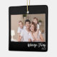 Personalize seu Enfeites de natal 2 fotográfico 2 anual com este simples design com 2 fotos, nome e ano em fundo preto. Use uma foto para cada lado. Texto personalizável clicando em "Personalizar este modelo". Perfeito para sua foto anual da família e como presente para pais, avós ou para você mesmo!