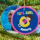 Um presente de Enfeites de natal da natação. Apresenta uma brilhante e divertida pop de cores e uma adorável garota morena de natação em um tubo interno. Personalize com o nome do seu filho e uma foto no verso.