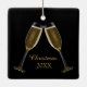 Elegante e moderno ornamento de fotos de Natal com árvore de Natal de ouro ornamentado e texto sobre sua fotografia e brinde de champanhe no verso. Personalize com nomes e ano para uma manutenção perfeita.
