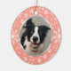 Personalize esta rosa claro do inverno e o padrão de impressão branco do floco de neve / pata com a foto do seu animal de estimação na frente. As costas têm uma modelo para adicionar o nome do seu animal de estimação e um ano. >>> Para alterar a fonte, o tamanho e a cor do texto, use o botão Personalizar. <<< A foto do animal de estimação e as modelos de texto personalizadas têm um quadro de borda impresso em prata falso.