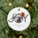 Uma design limpa e simples, mas festiva, com uma Foto embutida na palavra JOY contra a fruta sagrada muito feliz. Este ornamento de duas fotos é facilmente personalizado com sua personalização na frente e atrás. Presente ideal e guarde-o para esta época de Natal!