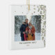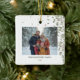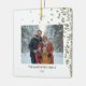 Elegante ornamento cerâmico de Natal com aquarela verde de inverno e fotografia da sua família. Pode ser personalizado com seu nome familiar, assim como o ano.