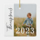 Enfeites de natal mínimo e moderno não-tradicional com um design simples e moderno com um roteiro de fotos da família e nomes da família de tendências. Sobreposição de fotos do ano frio. O verso apresenta uma segunda foto.