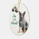 Na frente deste ornamento de Férias está uma imagem de um lindo Cão de Bovinos Australiano sentado em frente a um fundo de confete de ouro. Os ornamentos de bolbos de árvores negras e douradas penduram no lado esquerdo. O texto verde diz "Joy to the World". A parte de trás do ornamento tem o mesmo plano de fundo confetti e campos de texto para você personalizar cada ornamento, ou apenas vazio o texto se preferir.