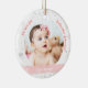 Trendy, elegante e fofinho personalizou First Christmas Baby Ornament para filhotes gêmeos para uma madrinha com flocos de neve e estrelas que tem uma abertura redonda para uma foto horizontal personalizada, e uma banda rosa curvada em cada lado na qual aparece o nome ou nomes dos gêmeos em uma elegante fonte / tipografia. Esta design inclui na frente as palavras "Nós te amamos, Madrinha Johanna!", que você pode personalizar ou apagar. No verso há um texto personalizado para o ano do primeiro Natal dos bebês.