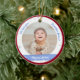 Trendy, elegante e fofinho personalizou First Christmas Baby Ornament para bebês gêmeos para vovô com um quadro branco com flocos de neve e estrelas que tem uma abertura redonda para uma foto horizontal personalizada, e uma banda azul curvada em cada lado na qual aparece o nome ou nomes dos gêmeos em uma elegante letra/tipografia. Esta design inclui na frente as palavras "Nós te amamos, vovô Jason!", que você pode personalizar ou excluir. No verso há um texto personalizado para o ano do primeiro Natal dos bebês. Com um quadro vermelho externo do Xmas.