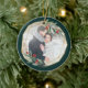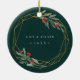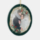 O Enfeites de natal fotográfico elegante apresenta uma foto favorita rodeada por uma falso estrutura geométrica de folha de ouro com folhagem verde de cor d'água e bagas vermelhas. Adicione seus nomes e o ano, ou uma mensagem personalizada, ao lado inverso em um quadro correspondente.