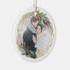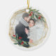 O Enfeites de natal fotográfico elegante apresenta uma foto favorita rodeada por uma falso estrutura geométrica de folha de ouro com folhagem verde de cor d'água e bagas vermelhas. Adicione seus nomes e o ano, ou uma mensagem personalizada, ao lado inverso em um quadro correspondente.