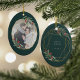 O Enfeites de natal fotográfico elegante apresenta uma foto favorita rodeada por uma falso estrutura geométrica oval de folha de ouro com folhagem de cor verde-d'água e bagas vermelhas. Adicione seus nomes e o ano, ou uma mensagem personalizada, ao lado inverso em um delicado quadro geométrico correspondente.