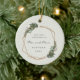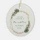 Você se casou este ano? Adicione uma memória à sua árvore com este ornamento cerâmico moderno com uma estrutura geométrica dourada cercada de verde e flores brancas. Dentro na moldura estão as palavras, "Nosso Primeiro Natal como Sr. e Sra." juntamente com seu sobrenome e ano. O fundo tem sua foto favorita. Este ornamento também faz um presente de excelente para um casal recém-casado para o seu primeiro Natal. Quadro cortesia de:<a href="http://www.freepik.com">Concebida por Freepik</a>