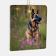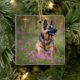 Este ornamento apresenta uma imagem de estação quente de um German shepherd de um lado e uma imagem de Natal ou feriado do outro. Pode ser usado durante todo o ano!