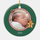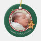 Um adorável ornamento fotográfico personalizado para comemorar o primeiro Natal do seu bebê. Ela vem com uma borda de gangues doces, biscoito holly e gengibre como elementos decorativos de Natal com fundo verde. Personalize com o nome do pequeno na frente e no ano atrás.