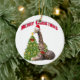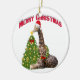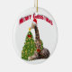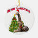 Adorável Girafa de Natal com seu Chapéu Santa e árvore de Natal decorada - ele está colocando a estrela em cima da árvore