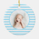 Enfeites de natal elegante, moderno e fofo para bebês sobre o padrão de listras azul para bebês. Esta modelo com uma ilustração adorável do bebê dinossauro Verde dormindo sob as estrelas amarelas douradas com o nome de Bebê personalizado. Inverta para revelar uma linda foto de bebê em círculo vermelho listrado. Excelente para o bebê e para a menina. Presente perfeito para todas as estações!