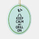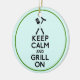 O ornamento cerâmico redondo, com uma imagem, em ambos os lados, da frase "Manter Calmo e Grill On" em letras negrito, tocado com utensílios de churrasco e um cachorro-quente no aqua. Fronteira verde. Veja a coleção inteira do Ornamento do Pai nos TOUCHES ESPECIAIS | Seção Favoritos para festas.