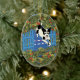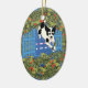 Um cão branco e preto toma um salto da agilidade na perspectiva de uma grinalda do Natal