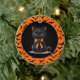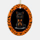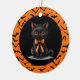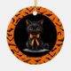 O ornamento cerâmico de festas de Halloween é mostrado com um impressão de gato preto bonito. Personalize este item ou comprar como está. Imagem licenciada
