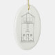 Tinta Home nova que tira ornamento cerâmico oval frente e verso Natal novo preto e branco da casa do primeiro. Mantenha a tiragem da casa na parte dianteira ou transfira arquivos pela rede sua própria imagem. Todo o texto sobre para trás pode ser personalizado. Esta imagem é de minha tinta original no desenho da mão de mylar de uma casa de campo rústica pequena com encantamento de detalhes arquitectónicos e a pedra pequena benches cada lado da porta.