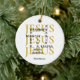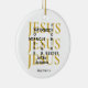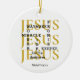 Personalizado JESUS Waymaker Christian Ornament com TEXT PERSONALIZÁVEL, projetado com algumas das descrições populares do Lord JESUS exibidas em formato de palavras cruzadas em tipografia negra ousada. Em segundo plano, o Nome de Jesus é repetido três vezes em serifa dourada. Por baixo da design, há um nome de espaço reservado, que é personalizável, para que você possa adicionar seu nome e inicial ou criar seu próprio texto. Este ornamento de Jesus faria um presente excelente para aniversários, Natal, e para qualquer um que amasse as seguintes citações inspiradoras baseadas na Escritura Bíblia: Deus fará um caminho no deserto; Deus sempre mantém Suas promessas; Jesus é a Luz do Mundo, e Deus é Um que trabalha milagres. Escolha entre uma ampla seleção de citações inspiradoras sobre presentes projetados por #bereandesigns