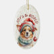 Na frente deste ornamento de Férias está uma bela imagem de um cão Corgi vestido com um chapéu de Papai Noel com ornamentos pendurados. Atrás da imagem está um fundo de aspersão de confete dourado. O texto vermelho diz "Joy to the World". A parte de trás do ornamento tem o mesmo plano de fundo confetti e campos de texto para você personalizar cada ornamento. Claro que traga alguns sorrisos na hora de Natal!