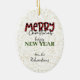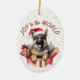 Na frente deste ornamento de Férias está uma imagem de um Cachorro German shepherd vestindo um chapéu de Papai Noel vermelho e branco e espiando uma caixa de presentes de Natal. Atrás da imagem está um fundo de aspersão de confete dourado. O texto vermelho diz "Joy to the World". A parte de trás do ornamento tem o mesmo plano de fundo confetti e campos de texto para você personalizar cada ornamento.