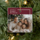 Featuring a rich burgundy background, modern white frame, and elegant holiday typography, this ornament beautifully showcases a cherished family photo. Crafted from smooth ceramic and finished with a classic hanging cord, it’s perfect for celebrating meaningful Christmas moments year after year.