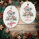 Este ornamento de crianças bonitinhas tem uma imagem de aquarela de um adorável urso koala vestindo um chapéu de Papai Noel vermelho e branco e segurando uma bengala doce. Atrás dele está um sorvete de sagrado com bagas vermelhas. O texto estilizado na parte inferior diz "Feliz Natal". O verso repete a imagem com o nome do seu filho e a sua própria assinatura.
