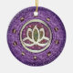 Ornamento roxo num olhar de crochê, decorado com pedra, com um símbolo de lótus prateado no centro