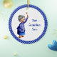 Este ornamento cerâmico é um presente maravilhoso para sua adorável avó. Seja para o Natal, Dia de as mães, ou qualquer outro feriado, este ornamento certamente trará um sorriso para a cara dela. O ornamento tem um círculo branco interno com ilustração de uma velha senhora de cabelo de cinza em um pão segurando uma colher de madeira. Ela está vestindo óculos e uma bela roupa azul e chinelos. A parte externa do ornamento, assim como o fundo, como um padrão cardíaco azul em dois tons de azul marinho. Ilustrada e projetada por Patricia Alvarez.