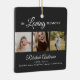 Este ornamento memorial de funeral de na moda, faria um excelente de guardar para amigos e familiares. O ornamento moderno apresenta 3 fotos do seu ente querido, Texto que lê 'EM MEMÓRIA DE AMOR' seu nome, datas e uma mensagem pessoal. Os estilos de fonte de texto, tamanho, cor e cor de fundo podem ser alterados clicando no link personalizar depois de personalizar.