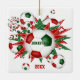 Este pomar cerâmico temático de futebol apresenta uma "explosão" de bolas de futebol vermelhas, brancas e verdes em tamanhos variados e formas festivas vermelhas, verdes e brancas - personalize com o nome e o ano do jogador ou da ventoinha - katz_d_zynes
