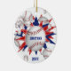 Este ornamento cerâmico legal de basebol/softball apresenta uma "explosão" de bolas de basebol/softbolas brancas de tamanho variado e formas de estrelas vermelhas, brancas e azuis - personalize com o nome e o ano do jogador ou do ventilador na frente e atrás - katz_d_zynes