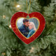 Este Enfeites de natal elegante apresenta a sua fotografia dentro de um quadro brilhante em forma de coração dourado. A armação é colocada sobre um fundo de folhas e vinhas de ouro bonito, sobre fundo vermelho Feriado. A parte de trás do ornamento tem o mesmo fundo dourado com seu texto personalizado em ouro mais escuro. Um presente maravilhoso para recém-casados, aniversários, ou qualquer casal. *Observe que a imagem está impressa e não contém metal.*