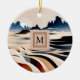 Este design de ornamento apresenta um design moderno, abstrato, paisagem desértica, com linhas rasteiras e cores em camadas parecidas com uma cena de pôr do sol ou duna, enquadrada por montanhas distantes. A paleta de cores inclui tons suaves de bege, creme, marinho e preto, criando uma atmosfera quente e serena. O design central exibe com destaque um monograma personalizável no meio, delimitado por um simples quadro quadrado. O monograma pode ser personalizado com suas iniciais, fazer-o pensativo e na moda.