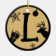 Temed de Natal, letra de monograma L, em preto sobre fundo dourado. O preto e o ouro podem ser modificados clicando no link 'personalizar mais'. Letra bonita L com flocos de neve, bauble, cabeça de veado e presente embrulhada.
