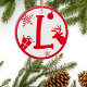 A letra do Natal, a letra do monograma L, em vermelho sobre fundo branco. Vermelho e branco podem ser modificados clicando no link 'personalizar mais'. Letra bonita L com flocos de neve, bauble, cabeça de veado e presente embrulhada.