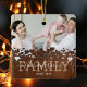 Enfeites de natal familiar rústico personalizado para a casa com uma foto da família de preciosos, um design cardíaco de madeira escura, a palavra "FAMÍLIA", seu nome em uma letra elegante, e a data.