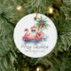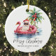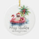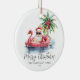 Entre no espírito de férias com este Enfeites de natal único com um Papai Noel relaxado em óculos escuros saltando em um flamingo rosa no oceano. Perfeito por adicionar uma vibe de praia à sua árvore de Natal, este ornamento é ideal para aqueles que vivem em locais tropicais como a Flórida, o Havaí, ou as Bahamas, ou para quem ama um tema divertido e costeiro. A cena inclui uma palmeira decorada com ornamentos, leves ondas oceânicas, e uma pequena ilha atrás de Papais noeis, todas capturadas em um encantador estilo de aquarela rústica. A mistura de fontes simples e tipografia de scripts adiciona um toque casual, mas elegante, enquanto a data é exibida na parte inferior para marcar a ocasião. Uma maneira divertida e festiva de trazer algum surf e areia para sua decoração de férias! Engraçado Ornamento De Cerâmica De Natal Em Praia Com Papais noeis De Verão Num Oceano De Palmeira Flamingo Flutuante