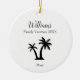 Lembre-se das férias tropicais da sua família com este ornamento personalizado da árvore de Natal. O ornamento é moderno e elegante e tem uma silhueta preta de uma palmeira e texto preto para o nome da sua família, o ano de férias e o destino da viagem. No verso há espaço para uma foto personalizada da família. Este ornamento é um encantador guardião que será precioso nos próximos anos.