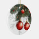 O Enfeites de natal cerâmico redondo é um belo encapsulamento do espírito de feriado. Você pode encontrar sobre eles árvores de Natal meticulosamente pintadas, enfeitadas com ornamentos em miniatura que adicionam um pop de cor contra o verde-luxuoso. Interligados dentro dos galhos estão flocos de neve delicados, cada um único e espumante, como se poeirados com uma nova camada de neve. Este ornamento apresenta decorações de Natal vermelhas num galho de árvore de Natal.
