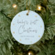 Caligrafia Elegante Elegante Azul e Ornament Cerâmico do Photo Baby no Primeiro Natal, recurso da Frente com texto "Primeiro Natal do Bebê", estrela dourada e nome personalizado do bebê. Pode personalizar a foto de bebê.