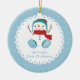Os primeiros enfeites de natal do bebê caracterizam um grupo adorável do menino do boneco de neve azul & branca fundo pontilhado em uma polca! Fácil personalizar com suas informação & data