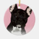 Enfeite de Natal de bulldog francês inspirado em pop art excêntrico com um cão frenchie brindle preto em um fundo rosa pastel que pode ser alterado para qualquer cor, adicione o nome do seu animal de estimação.